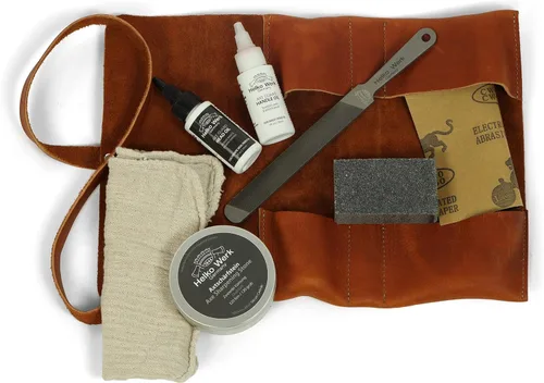 • fino (verde): grano 320. El lado grueso de la piedra de hacha debe utilizarse para restaurar bordes apagados, mientras que la fina realiza un afilado más fino con la herramienta de afilado de hachas. Esta piedra se puede utilizar en seco, o con agua o aceite como lubricante. El uso de aceite producirá los mejores resultados, pero la piedra también se puede utilizar con agua o simplemente secar. Lima de doble cara fabricada en Alemania: lima de afilar hacha de doble cara hecha de acero alemán C125W2 de alto carbono. Este afilador de hacha de archivo tiene una parte superior que es un patrón de dientes finos de un solo corte. La parte inferior es un patrón de dientes finos de doble corte. Los dientes de doble corte de la herramienta de archivo proporcionan una eliminación rápida de material más agresiva para reperfilar, o eliminar abolladuras y muescas forman un borde de hacha, y el corte único ofrece un afilado fino. Funda de cuero vacuno de grano completo: un excelente accesorio para proteger y llevar tu kit de mantenimiento Helko Werk 1844. Con el tiempo, el cuero envejecerá bien y desarrollará una pátina a través del uso.