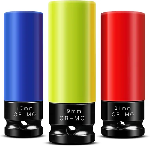 Material Cr-Mo: El casquillo de tuerca de rueda de 1/2" de BOEN está hecho de acero de aleación cromo-molibdeno. Los materiales Cr-Mo (Chromoly) típicamente ofrecen excelente resistencia, resistencia al desgaste y dureza, haciéndolos altamente efectivos en ambientes de alta carga y alta presión. Pueden manejar un par de torsión más alto que los dados estándar de Cr-V o carbono, como en aplicaciones de maquinaria automotriz e industrial. Además, tienen buena resistencia al calor, lo que los hace adecuados para operaciones de alta temperatura Calidad excepcional: El casquillo de tuerca de orejeta cuenta con un recubrimiento electroforético negro especial, que ofrece una resistencia superior al óxido en comparación con los casquillos estándar tratados con fosfato, mejorando su resistencia a la corrosión. También incluye codificación de colores y grabado láser para una fácil identificación del tamaño y legibilidad Protección integral: La cubierta resistente a los arañazos de 360° y las inserciones internas libres de daños proporcionan una protección perfecta para sus llantas y tuercas durante el montaje o desmontaje. Incluso en espacios reducidos, la llave de vaso profunda maneja fácilmente sujetadores largos, asegurando una extracción suave y sin complicaciones de los pernos Diseño de 6 puntos: el juego de llaves de vaso de pared delgada BOEN está diseñado con accionamiento lateral de 6 puntos para evitar el redondeo de los sujetadores aplicando fuerza a las caras planas de los sujetadores en lugar de a sus esquinas. Los mantendrá intactos bajo alto par de salida sin deformación. Los orificios de los pasadores de clavija sujetan perfectamente los enchufes de la rueda y las herramientas correspondientes para evitar que se caiga Muy utilizado: Nuestro juego incluye 3 llaves métricas: 17 mm (azul), 19 mm (amarillo) y 21 mm (rojo). Ampliamente utilizado en varios escenarios y campos, incluyendo reparación y mantenimiento de automóviles, servicios de neumáticos, vehículos de carreras y alto rendimiento, ensamblaje de cubos, y mantenimiento del sistema de ruedas y suspensión. Durante los cambios de neumáticos, la extracción del cubo o la instalación, el casquillo protector evita daños en las llantas y tuercas, preservando su apariencia y funcionalidad Portabilidad y Protección: El set viene con un estuche de almacenamiento moldeado por soplado para una organización rápida, almacenamiento y transporte, haciéndolo ideal para cualquier hogar, garaje, proyecto de bricolaje o reparación automotriz profesional. Los casquillos de impacto del protector de rueda cumplen o superan los estándares ASIN. Ofrecemos una garantía de calidad de 1 año; si tienes alguna pregunta, no dudes en ponerte en contacto con nosotros
