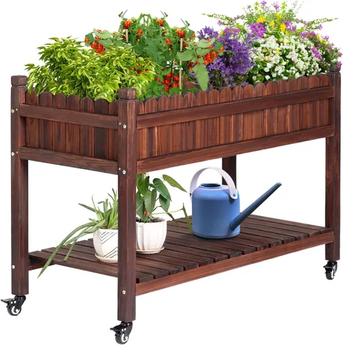 Estable y duradera: la cama elevada para jardín está hecha de madera de abeto maciza de larga duración, puede soportar firmemente el peso de la cama del jardín, tierra y planta, ideal para uso durante todos los años. La madera gruesa con pintura ambiental tiene bordes lisos, sin rebabas y es más resistente a la corrosión. Multifunción: un forro incluido para separar la madera del suelo y mantenerla en excelentes condiciones. Los orificios de drenaje permiten que el exceso de agua se drene a tiempo para mantener la tierra fresca y evitar que las plantas se ahoguen o rieguen demasiado. 【Características adicionales】Cama de jardín elevada sobre ruedas, muévete a cualquier lugar que desees. El estante de almacenamiento proporciona un lugar espacioso y conveniente para trabajar y almacenar, se puede utilizar para almacenar herramientas de jardín o poner macetas para exhibir. Ergonómico: el diseño de 34 pulgadas de alto elimina la necesidad de doblarse o arrodillarse, preservando tu espalda y rodillas. Diseñado con una cama de casi 8.3 pulgadas lo suficientemente profunda como para garantizar que tus plantas y verduras puedan respirar y crecer saludables. Dimensiones: 47.7 pulgadas de largo x 22 pulgadas de ancho x 33.9 pulgadas de alto. Capacidad de peso: 290 libras. Suministros de jardín: la cama elevada es perfecta para plantar y mostrar flores, verduras y frutas. Con esta maceta de madera, puedes cultivar plantas como verduras, flores, hierbas en tu patio, jardín e invernadero. Las plantas estarán sanas y fuertes en este lecho elevado natural, y más convenientes de manejar.