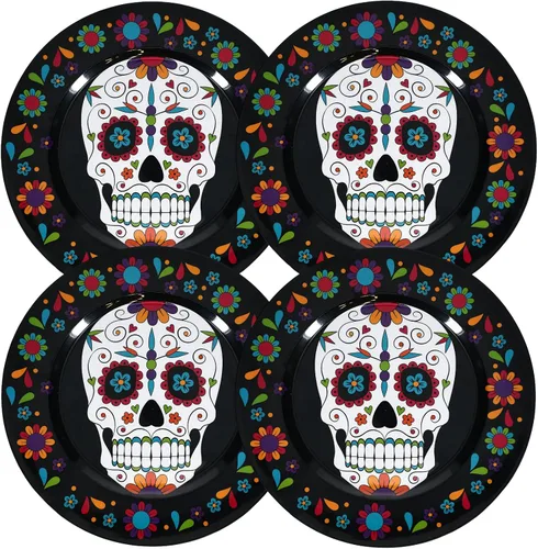 SUGAR SKULL: Platos Bajos Plásticos de 13" - Día de los Muertos - Día de los Muertos JUEGO DE CARGADOR DE 4 PIEZAS: Con calaveras de azúcar con bordes florales coloridos HERMOSA PRESENTACIÓN: Para fines decorativos, no destinados al contacto directo con alimentos LIMPIEZA CON LIMPIEZA: No apto para lavavajillas, evitar el uso de abrasivos y productos químicos agresivos Grandes piezas de presentación para tu mesa o pared de vacaciones