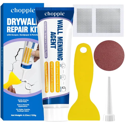 Kit de reparación de paneles de yeso Choppie Con nuestra fórmula de secado rápido, puede lograr reparaciones rápidas y eficientes, ahorrándole tiempo y esfuerzo, prácticamente sin rastros notables de la reparación. Nuestro kit de reparación de paneles de yeso es fácil de usar, lo que te permite realizar fácilmente reparaciones de paredes en casa, abordando todo, desde pequeños agujeros hasta grietas con una precisión impecable. Diseñado para abordar varios daños en la pared, nuestro kit de reparación de paneles de yeso es adecuado para paredes interiores, techos, marcos de puertas, suelos y varias otras superficies. Se adapta a una variedad de necesidades de reparación del hogar. Instrucciones: 1. Scueze la pasta de reparación en el área a reparar. 2. Raspe el lote de pasta de reparación de paredes y espere a que se seque por completo. Precauciones: Mantenlo alejado de niños y mascotas. Evita que entre en tus ojos. Si está en contacto con los ojos, lávese con agua. Especificaciones: Contenido neto: 4.2oz/120g Detalles de embalaje: 1 agente reparador de paredes, 1 extensor de boquilla, 1 raspador, 1 papel de lija, 2 parches de paneles de yeso