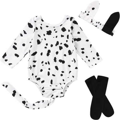 Conjunto de 3 piezas de disfraz de Halloween para bebé recién nacido, mameluco dálmata con sombrero en forma de oreja + calcetines dálmatas