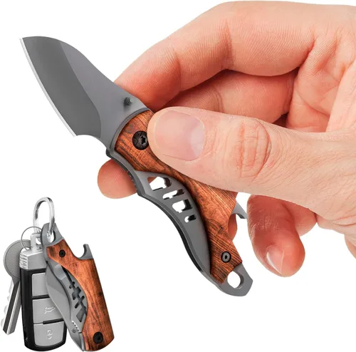 Cuchillo de bolsillo pequeño para hombres – Cuchillo de llavero de 5.7 pulgadas con abridor de botellas – Cortador de cajas – Mango de madera –