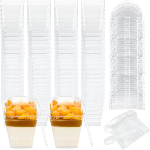 Pregunta sugerida sobre DAJAVE Paquete de 100 tazas de plástico para postres de 5 onzas con tapas y cucharas, tazas de parfait cuadradas transparentes con tapas, mini tazas ¿Qué incluye exactamente este set?