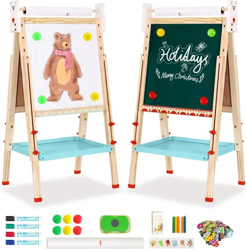 Caballete artístico para niños, pizarra blanca de doble cara y pizarra de tiza con rollo de papel, caballetes para niños con accesorios para niños y