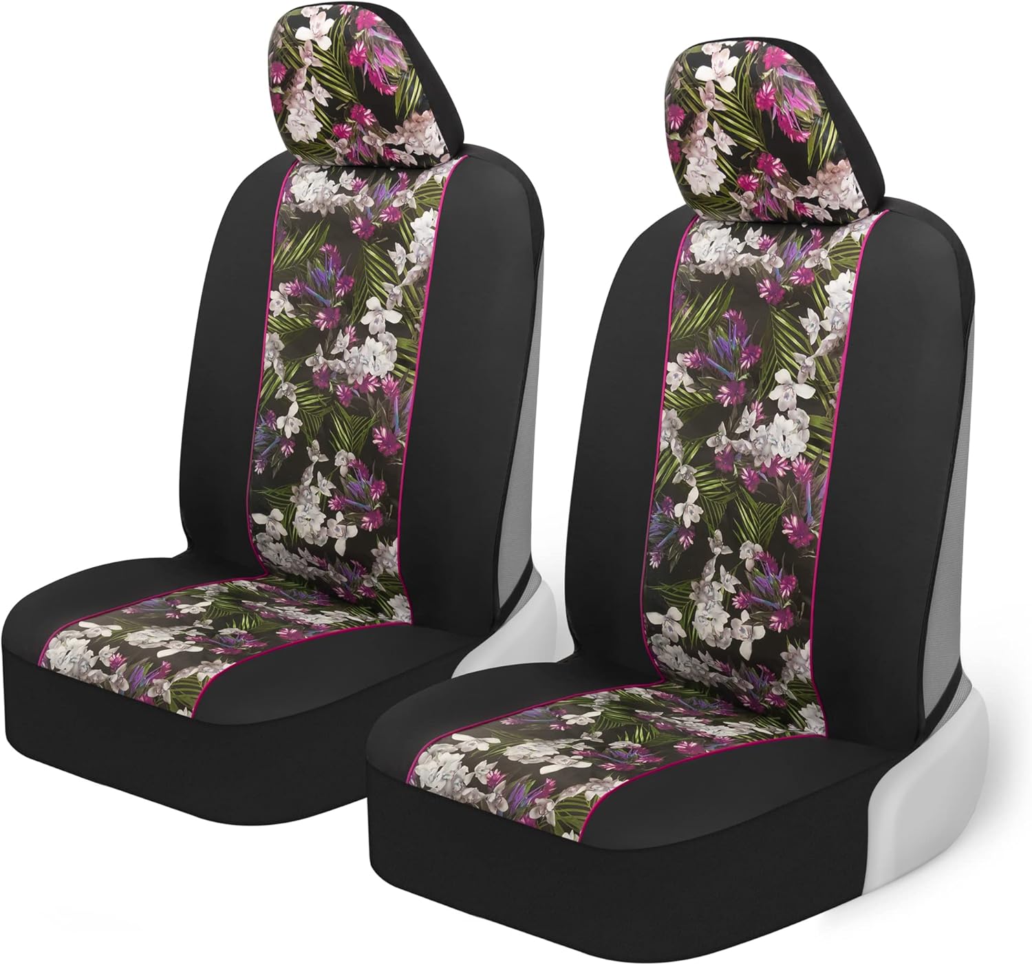 BDK Fundas de asiento de coche de piel sintética con flores rosas para asientos delanteros, paquete de 2 – Patrón floral con reposacabezas a juego,