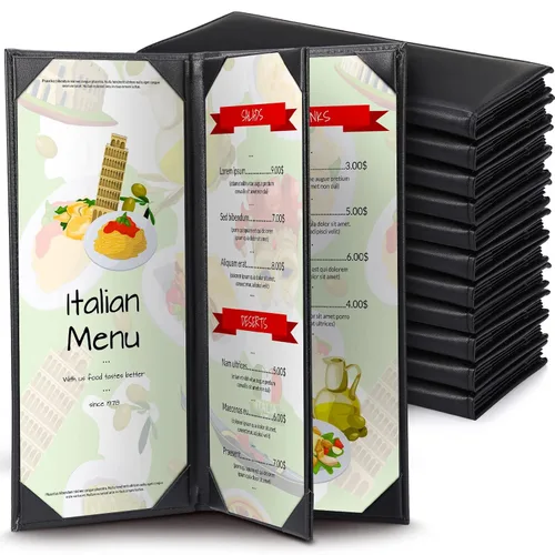 Diseño simple: nuestra cubierta de menú impermeable de 3 vistas está diseñada en negro, lo que permite a tus invitados ver el menú cómodamente y mantener el menú limpio, mejora el menú de tu restaurante o cafetería con este libro de portada de menú de estilo clásico Práctico y práctico: estos libros de menú de restaurante tienen una función deslizante, que se puede insertar y cambiar el menú rápida y fácilmente, y se adapta a la mayoría de menús de papel cuyo tamaño es de aproximadamente 4.25 x 11 pulgadas Material de calidad: la carpeta de menú está hecha de piel sintética impermeable, los materiales de calidad garantizan la resistencia al desgaste y durabilidad de la cubierta del menú, y son fáciles de limpiar con un paño suave Resistente al agua y al aceite: la superficie de esta funda de menú de cuero es impermeable y resistente al aceite, cuando derramas accidentalmente algo en la cubierta del menú, simplemente puedes limpiarla con una servilleta o toalla Tamaño general: el tamaño ampliado de la cubierta del menú de 3 vistas de café es de aproximadamente 11.5 x 16 pulgadas, adecuado para la mayoría de menús, y es ideal para varias ocasiones, como restaurantes, bares, hoteles, cafeterías, etc
