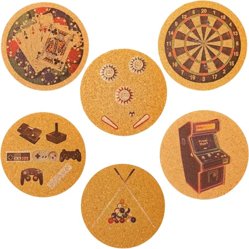 Diseños únicos de sala de juego: incluye seis diseños distintos (tablero de dardos, pinball, cartas y fichas, bolas de billar y palos, evolución del controlador de juego y videojuego arcade) para mejorar cualquier sala de juegos o decoración de cueva de hombre. Material de alta calidad: hecho de corcho sólido para una durabilidad superior, aislamiento natural y protección ecológica contra derrames y condensación. Impresión de tinta UV vibrante: la tinta UV de alta definición garantiza que cada diseño permanezca nítido, vibrante y resistente a la decoloración con el tiempo. Gran tamaño: cada posavasos mide 4 pulgadas de diámetro y 0.2 pulgadas de grosor, ideal para usar con cualquier bebida o como acento decorativo. Versátil y funcional: ideal para bares en casa, salas de juegos, oficinas y como un accesorio de inicio de conversación que añade carácter a cualquier espacio.