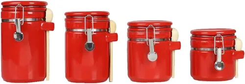 ALMACENA ALIMENTOS Y INGREDIENTES SECOS PARA UNA MEJOR ORGANIZACIÓN: Deja de dejar los ingredientes sueltos en el mostrador y consigue un lugar organizado y decorativo para ponerlos. Ya sea que estés almacenando dulces, granos de café, mezcla de frutos secos, azúcar u otras especias, utiliza este juego de recipientes de cocina para ayudar con tus necesidades de almacenamiento y organización Hecho de cerámica fina con cierres seguros: este juego de decoración de cocina rojo está hecho de cerámica, que se ve audaz y sorprendentemente hermoso en cualquier cocina contemporánea. Cada recipiente de cerámica viene acompañado de un cierre de metal para mantener todo su contenido dentro de forma segura Incluye cuatro cucharas de madera para una fácil recogida: este juego de recipientes de cocina rojos incluye cuatro cucharas de madera que te permiten sacar fácilmente el contenido si los estás utilizando para almacenar alimentos básicos para hornear y especias CUATRO DIFERENTES TAMAÑOS PARA CUMPLIR CON TUS NECESIDADES DE ALMACENAMIENTO DE ALIMENTOS: Se incluyen cuatro botes, que varían en diferentes tamaños, y ya sea que estés almacenando mucho o poco, siempre tendrás el bote adecuado para acompañarte. Estos recipientes de almacenamiento de alimentos tienen capacidades de 3 tazas, 4 tazas, 5 tazas y 5 1/2 tazas SERVICIO DEDICADO AL CLIENTE CON SATISFACCIÓN GARANTIZADA: Nos dedicamos a brindarle la mejor experiencia al cliente. Si tienes alguna pregunta, no dudes en ponerte en contacto con nosotros y estamos encantados de ayudarte