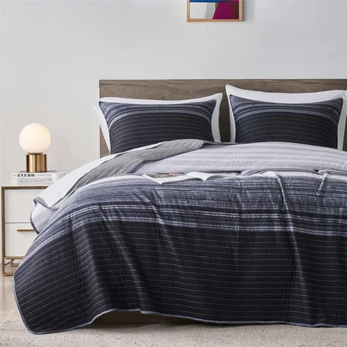 [Diseño de rayas simples]: El juego de cama de edredón full/queen presenta un diseño simple con rayas de retazos en negro, blanco y gris. El estilo simple pero elegante le da a tu dormitorio una bonita actualización. Revitaliza tu hogar con una fachada moderna y elegante. Adecuado para niños, adolescentes, mujeres y hombres. Juego de edredón Queen de 3 piezas: Puedes obtener un juego de edredón Queen de 3 piezas con 1 colcha (90 x 96 pulgadas) y 2 fundas de almohada (20 x 26 pulgadas). Se ajusta perfectamente a tu cama tamaño queen. El edredón tamaño queen puede llegar arrugado debido a la bolsa sellada al vacío. Por favor, colócalo al sol y dale palmaditas suaves para que quede esponjoso. Suave y cómoda: colcha a rayas grises tamaño queen hecha de tela 100% microfibra con relleno de poliéster de primera calidad. Suave, ligero y cómodo. Creando un ambiente acogedor y cómodo para dormir y proporcionando sensaciones similares a las nubes para tu familia. [Duradero y práctico]: el juego de edredón a rayas tamaño queen utiliza costuras bordadas ajustadas para evitar que el relleno se mueva o se apelmaze. Duradero para un uso prolongado. Versátil y práctico para varias ocasiones. Perfecto como un edredón fino de verano, como una colcha extra en invierno, como colcha para mascotas, o como un elemento de decoración de cama simple y elegante. Cuidado fácil y consejos cálidos: La colcha a rayas tamaño queen se puede lavar por separado a máquina en agua fría con ciclo suave. Secar al sol o secar en secadora a baja temperatura. No usar blanqueador ni limpiar en seco. El juego de cama acolchado se mantendrá bien después de repetidos lavados. Compra con confianza.