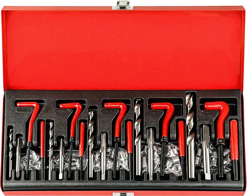 [Especificaciones y embalaje]: 110pcs insertos de hilo de alambre: 25xM5, 25xM6, 25xM8, 25xM10, 10xM12. 5 brocas giratorias, 5 herramientas de pasador de ruptura, 5 herramientas de instalación, 5 grifos, 1 llave hexagonal. [Función]: El kit de reparación de roscas métricas se puede utilizar para reparar roscas internas dañadas o peladas en automóviles y motores. [Material]: Las herramientas de instalación toman una construcción clásica de acero de alta velocidad, que es robusta y este diseño especial puede proporcionar un trabajo de reparación de rosca eficiente. Además, los insertos son de acero 45 # tratado térmicamente que poseen una mayor resistencia y una vida útil más larga. Ventaja: el kit de helicoil toma los bits de tamaño métrico más utilizados y coincide con el trabajo de instalación. Esto tiene una buena maniobrabilidad y puede ayudarte a hacer el trabajo rápidamente. [Reemplazo rápido, instalación segura]: todos los componentes están empaquetados en una funda de transporte de acero para un almacenamiento y extracción rápida y fácil.