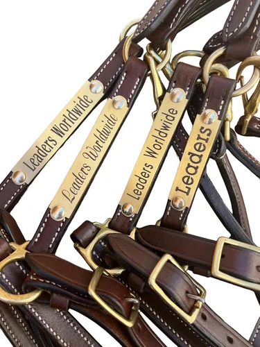 Leaders - Cabestro de cuero de 3/4 pulgadas para caballos con placa de nombre grabada personalizada, cuero marrón con herrajes de latón macizo