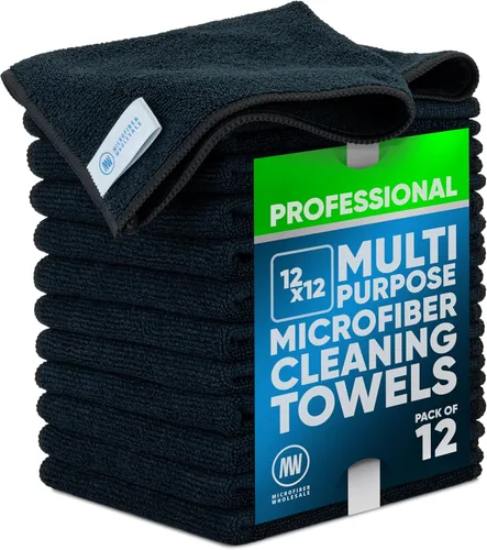 Paños de limpieza de microfibra Pro multisuperficie de 12 x 12 pulgadas | Negro - Paquete de 12 | Toallas de microfibra premium para limpiar vidrio,
