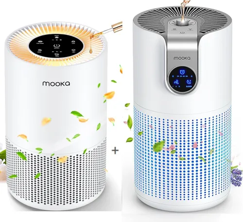 Purificadores de aire para habitación grande con aromaterapia, color blanco, paquete de 2 Filtración de alta eficiencia: con entradas de 360 grados y filtro de 3 etapas, el purificador de aire Mooka M03 puede filtrar eficazmente partículas más grandes, hasta 1500 pies cuadrados de cobertura y refrescar rápidamente una habitación de 400 pies cuadrados en solo 15 minutos. Purificadores de aire más rápidos para dormitorio, sala de estar, cocina, oficina, habitación del bebé, sótano, hotel, etc. Perfecto para dueños de mascotas, bebés, niños, ancianos o cualquier persona que quiera mejorar la calidad del aire Disfrutando del aire fragante: diseñado con respiraderos difusores de 360°, puede agregar aceites esenciales a la almohadilla de aromaterapia superior de acuerdo con sus propias preferencias. Una buena opción de purificadores de aire para olores de mascotas y olores desagradables. Multidimensional mejora el ambiente del aire mientras aporta un aroma agradable a ti y a tu familia. Proporciona la máxima relajación para el cuerpo y la mente. Fácil de usar con ajustes inteligentes: 4 ajustes de temporizador integrados (2H-4H-6H-8H) y 4 modos de velocidad del ventilador (sueño/bajo/medio/alto) para capturar tantos contaminantes del aire como sea necesario. Con el modo de suspensión de 15 dB, este purificador de aire doméstico no molestará tu dulce sueño, e incluso un bebé de sueño ligero puede disfrutar del aire cómodo en una noche tranquila. El bloqueo infantil evita operaciones de error causadas por mascotas o niños. (La luz nocturna se puede encender/apagar en cualquier momento). Indicador de cambio de filtro: Cuando el filtro de aire se ha utilizado durante más de 1440 horas, esta luz de botón parpadeará indicando que necesita reemplazar un nuevo filtro. Después de cambiar uno nuevo, mantenga presionado el botón durante 3 segundos, para restablecer la luz indicadora, el temporizador se reinicia.