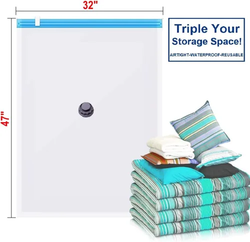 Este paquete se incluye con 50 bolsas de almacenamiento al vacío de tamaño extra grande de 47 x 32 pulgadas. Producto extremadamente útil para organizar el hogar, almacenamiento, embalaje, mudanza o viajes. Guarda esos artículos voluminosos como mantas y almohadas y reduce el volumen hasta un 75%. También es ideal para empaquetar o mover para almacenar cualquier cosa como una bolsa reutilizable ultra grande con cremallera. El sello hermético e impermeable mantiene fuera la humedad y la suciedad. Los artículos almacenados vuelven a su forma y tamaño completos. Viene con válvula de succión de vacío en cada bolsa para extraer el aire de la bolsa mediante una aspiradora o bomba. A diferencia de cualquier otra bolsa de almacenamiento al vacío, solo utilizamos material de PA (nailon) + PE duradero y más flexible en comparación con otros que utilizan PET + PA de bajo costo (material más grueso) que se agrietará con el tiempo extra como resultado de fugas de aire.