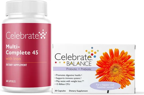 Apoyo nutricional integral: el paquete de vitaminas bariátricas Celebrate combina dos suplementos esenciales: el multivitamínico de hierro multicompleto de 45 mg y cápsulas probióticas de equilibrio + prebióticos. Juntos, proporcionan una solución completa para el bienestar de la cirugía posbariátrica, proporcionando vitaminas, minerales y apoyo digestivo esenciales para ayudarlo a mantenerse en el camino con sus objetivos de salud después de la gastrectomía de manga o la cirugía de bypass gástrico Absorción optimizada de nutrientes: Multi-Complete está formulado para mejorar la absorción de nutrientes clave como hierro, vitaminas A, D y E, y minerales quelados, todo diseñado para el ambiente de bajo ácido común en pacientes de cirugía bariátrica. Cada cápsula contiene una dosis dividida de 45 mg de hierro para apoyar los niveles de hierro sin causar molestias estomacales. Esta fórmula garantiza que tu cuerpo reciba la máxima biodisponibilidad de nutrientes esenciales para la recuperación y la salud en general Apoyo avanzado para la salud digestiva: las cápsulas probióticas y prebióticas de equilibrio ofrecen 28.5 mil millones de UFC de cinco cepas probióticas beneficiosas, ayudando a restaurar y mantener el equilibrio de la flora intestinal después de la cirugía. Los prebióticos nutren aún más a los probióticos, creando un ambiente óptimo para una digestión saludable y absorción de nutrientes. Juntos, ayudan a manejar los desafíos digestivos postoperatorios y apoyan un microbioma próspero Fórmulas seguras y amigables con la bariatría: los productos Celebrate Vitamins están diseñados teniendo en cuenta las necesidades únicas de los pacientes de cirugía bariátrica. Ambos suplementos cumplen con las pautas de ASMBS y son libres de gluten, sin azúcar y libres de colores artificiales. Las cápsulas fáciles de tragar garantizan un uso diario conveniente, mientras que los probióticos estables ofrecen flexibilidad sin refrigeración Calidad premium en la que puedes confiar: Respaldado por más de 15 años de experiencia, Celebrate Vitamins fabrica sus productos en instalaciones certificadas por GMP en los Estados Unidos. Este paquete representa un compromiso con la artesanía superior, ofreciendo soluciones confiables y de alto rendimiento que priorizan su salud nutricional y digestiva después de la cirugía