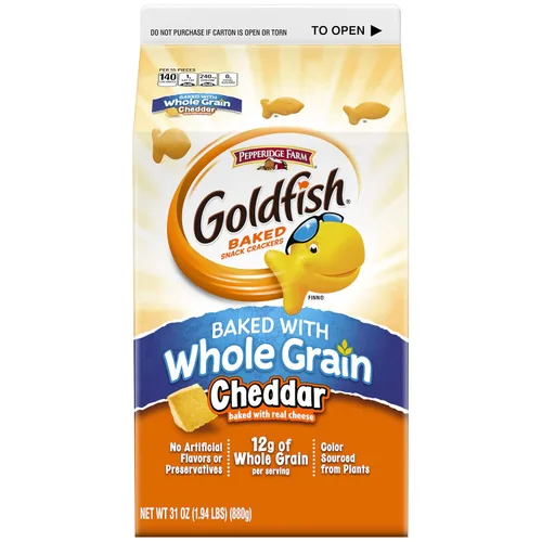 Bondad versátil: las galletas Goldfish son un regalo perfecto en los menús infantiles de su restaurante o se sirven como acompañamiento de un sándwich en entornos de atención médica. También puede servirlo como aderezo en recetas como macarrones con queso o una ensalada Beneficios del producto: Las galletas Goldfish se hornean con queso real y contienen 0.42 oz de grano entero y 0.00 oz de grasas trans por porción. Contiene 140 calorías por porción y sin sabores artificiales ni conservantes Bocadillo multiusos: perfecto para almuerzos escolares y programas después de la escuela, eventos de catering, instalaciones de vida para personas mayores y asistidas, hospitales y dormitorios, estas galletas Goldfish son un regalo satisfactorio y saludable para todas las edades Sabor Cheddar clásico: repleto del sabor y el crujiente que te encanta; estas galletas Goldfish están horneadas con queso cheddar 100% real. Ten en cuenta que el embalaje puede variar La forma que amas: trae sonrisas a más invitados con la divertida forma Goldfish