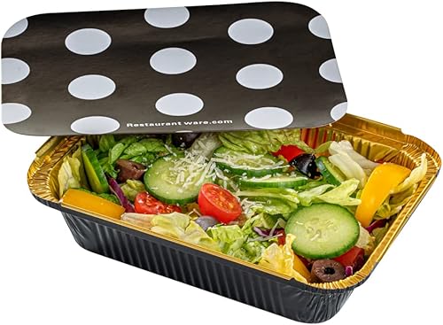Elegante embalaje de alimentos: la llamativa sombra negra y dorada y la tapa de papel de lunares de estos recipientes para llevar añaden elegancia a su servicio de entrega. Añade estilo a tus pedidos de alimentos. Tapas resistentes incluidas: estos recipientes de aluminio vienen con tapas de papel planas a juego para evitar derrames, bloquear el calor y proporcionar un transporte fácil y sin problemas. Embalaje seguro Listo para horno y congelable: hechos de aluminio de primera calidad, estos recipientes rectangulares de aluminio son ideales para almacenar y recalentar las sobras. Además, forrado con papel de aluminio plateado para retener el calor de los alimentos calientes. LIMPIEZA SIN ESFUERZO: Diseñados para la simplicidad, estos recipientes de alimentos duraderos son convenientemente desechables. Sin estrés de limpiar después de la comida, ofreciendo una experiencia gastronómica optimizada incluso sobre la marcha. 50 CONTENEDORES DE ALUMINIO: Estos recipientes de alimentos miden 7.3 pulgadas de largo por 5.3 pulgadas de ancho por 2 pulgadas de alto y contienen hasta 16 onzas. Recibirás 50 recipientes desechables.