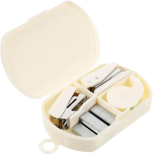 STOBOK Mini carpeta, mini grapadora, 2 juegos de caja de herramientas de mano, perforadora de agujero de metal blanco, escritorio multifunción
