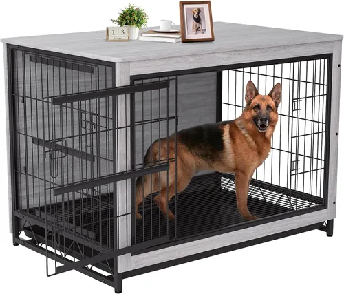 TLSUNNY Muebles de jaula para perros, 44.1 pulgadas de madera para interiores con 2 puertas, jaula resistente con bandeja extraíble, mesa auxiliar,