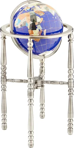 Este exclusivo globo de piedras preciosas de lapislázuli azul es nuevo y está en perfectas condiciones. Está cuidadosamente hecho a mano por los artistas más talentosos, utilizando más de 30 piedras preciosas semipreciosas diferentes de todo el mundo. Este globo ha utilizado una gran cantidad de piedras de lapislázuli que pulverizaron, y se mezclan con un epoxi y vertido para hacer que el océano sea parte del globo (es un procedimiento muy complicado y costoso, el control preciso de la temperatura es el factor más esencial en el ciclo de procesamiento). Esta es una gran cantidad de trabajos de piedra llamativos y dramáticos hechos a mano. Este globo de perlas está construido con el hermoso soporte de metal cinínico recubierto de plata pesada de cuatro patas en el que el globo ha sido cuidadosamente montado. En la parte inferior del soporte, se incorpora una brújula de latón integral con tapa de vidrio precisa para complementar el globo. Cada país está incrustado de una piedra diferente, y las piedras se cortan y muelen individualmente a formas entrelazadas exigentes, pulidas y colocadas en esta exquisita obra de arte con cuidado y atención a las adyacencias. Los elementos del globo se crean a partir de lapislázuli, nácar, amatista, jade africano, ojo de tigre, jaspe, turquesa, cuarzo púrpura, ónix, unakita, abulón, mármol verde y muchas otras piedras bellamente tonificadas y ricamente veteadas. Las líneas de latitud y longitud son cintas muy finas de latón pulido, incrustadas a través del globo. Cada globo requiere diez pasos individuales para componer y se necesitan más de 2000 horas de trabajo para completarse.