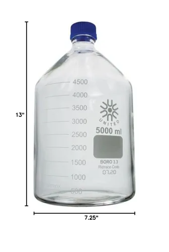 Capacidad: 5000mL (5L) Rango de graduación: 500-4500mL, Intervalo de graduación: 500 mL Estas botellas de vidrio de borosilicato de uso general se pueden lavar en autoclave con graduaciones impresas en blanco permanente y puntos de marcado. La abertura de la rosca del tornillo tiene una identificación. de aproximadamente 1.181 in La tapa GL 45 suministrada no tiene forro y tanto la tapa como el anillo libre de goteo son de polipropileno y se pueden lavar en autoclave a 284.0 °F. La temperatura máxima de uso de las botellas es de 842.0 °F. Diseñado para su uso en el laboratorio, Classoom u hogar