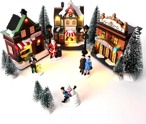 Valery Madelyn Juego de decoración de casa de pueblo navideño preiluminado, funciona con pilas, accesorios de figura de Navidad, colección