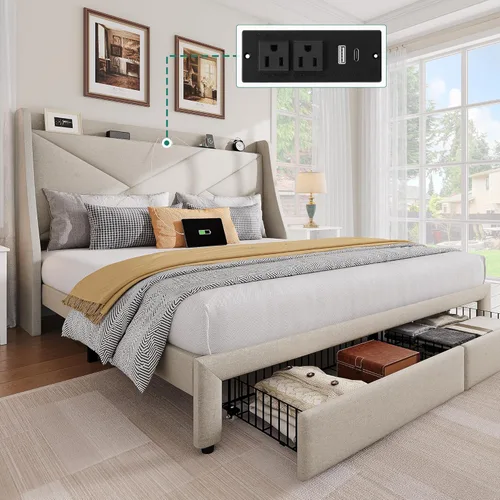 YITAHOME Base de cama de almacenamiento, marco de cama de tamaño matrimonial con puerto tipo C y USB y 2 cajones, cabecera tapizada, plataforma
